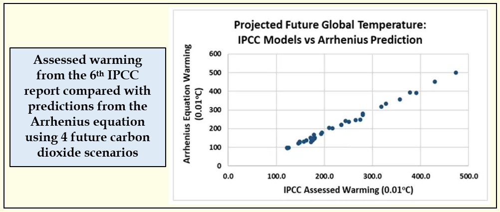 Projections for carbon dioxide concentration and change in global temperature were extracted as average values across the community of climate models for 4 often-cited scenarios (see Sources below). Summarized as decadal time steps from 2020 to 2100, the Arrhenius equation with the same value of alpha (4.05), provides an exceptionally strong relationship (see next figure). The average difference between the model-projected temperatures and what Arrhenius would predict is less than 19 one-hundredths of a degree (over a range of 400).