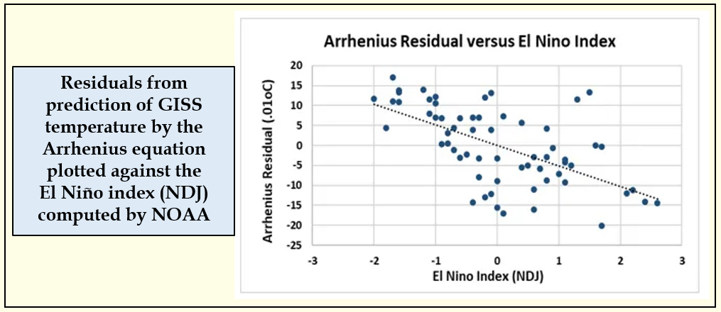We could. Plotting the residuals as calculated in the spreadsheet against the El Niño index revealed a significant relationship (below). Adding this as a second factor to the original Arrhenius relationship reduced the error in prediction to about 0.06 or 6 one-hundredths of a degree. Being able to detect this second relationship supports the precision of the relationship between carbon dioxide and temperature alone.