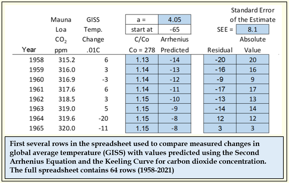 The "Arrhenius Predicted" column uses the equation above with the C/Co number for that row and the alpha number (a =) to predict temperature change. The Residual is the difference between that predicted number and the measured GISS number (in hundredths of a degree Celsius). The Absolute Value column is Residual expressed as a positive number - the "distance" between the GISS data and the Arrhenius prediction. The Standard Error of the Estimate is the average of all absolute values.