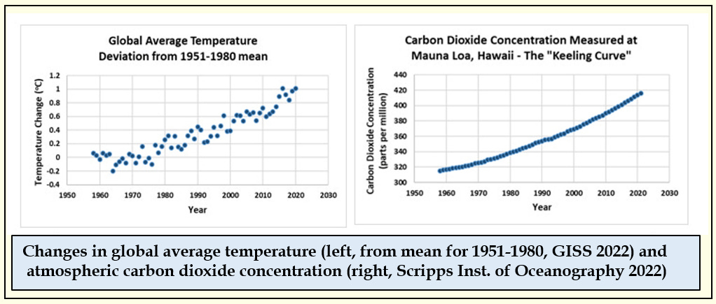 Both of these data sets are rigorously reviewed, updated continuously and published openly. We owe a great deal to those dedicated scientists and technicians who maintain these vital records! It is always surprising to me how few people are familiar with the "Keeling Curve" of carbon dioxide concentrations on the right. I think of it as the environmental icon of our time.